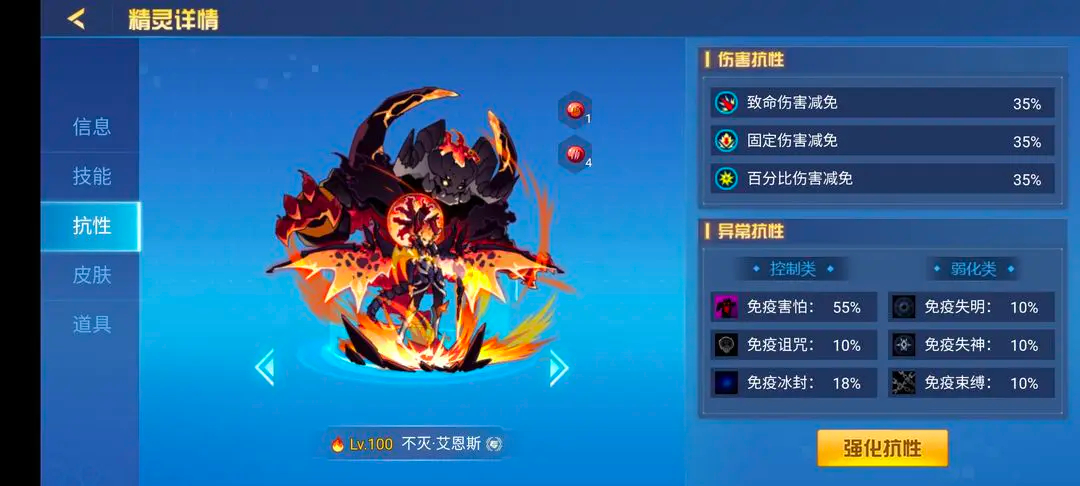 抗性的话,我个人建议刷害怕抗性——主要针对索兰森、猎皇和万魔天尊。前两位的威胁不用多说,最后这位可是2020年新出的“带恶人”精灵,不过有害怕抗性的火王完全能压制住它。套装搭配推荐毒液、笑傲或腐蚀这几套。