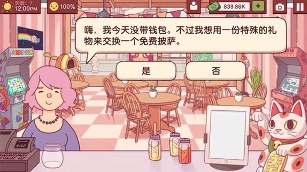12、若你已解锁蘑菇、橄榄、洋葱和青椒,遇到此情况就点“是”;要是配料不齐全,就点“否”。之后还会给你50元。普通披萨的配料为酱料、芝士、蘑菇、橄榄、洋葱和青椒,顺便提一下,纯素食披萨的配料是酱料、蘑菇、橄榄、洋葱和青椒,即比普通素食披萨少了芝士。