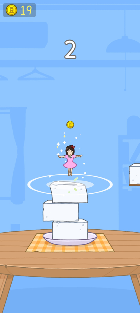 虽然游戏上手十分容易,但是玩到高分并不容易,玩家需要操纵女孩不断的跳跃并堆积豆腐块,最后结束后堆积的豆腐块越多,得分才能越高。
