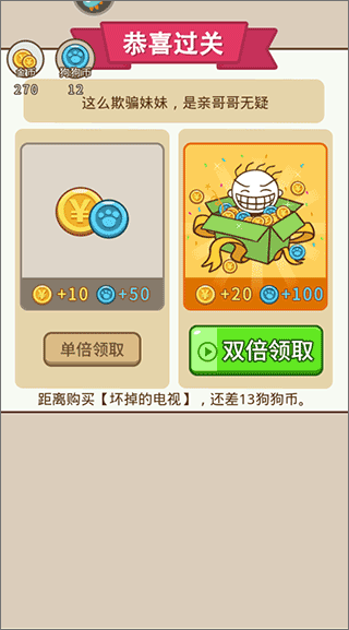 5、如此便通过啦,玩家能够获取奖励,可点击单倍领取,也能选择观看广告来领取更多奖励。