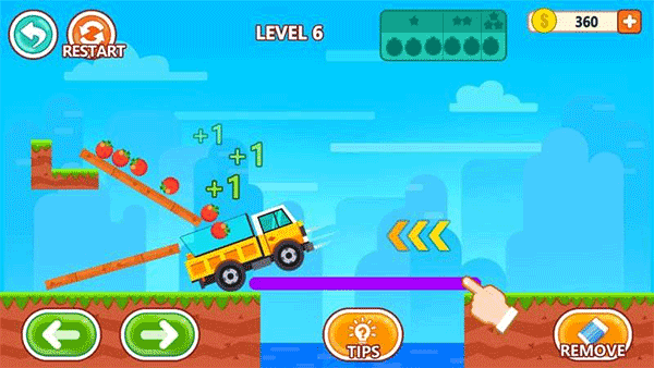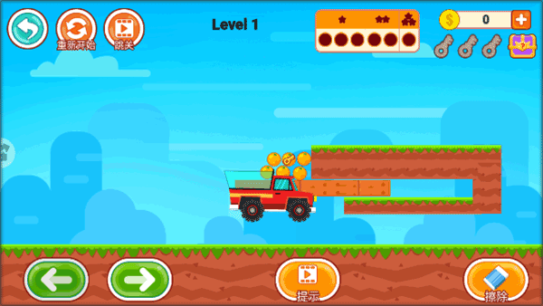 2、点击右箭头,车辆就会依照你之前所画的线向前行驶,把水果卡进货车的货厢之中。