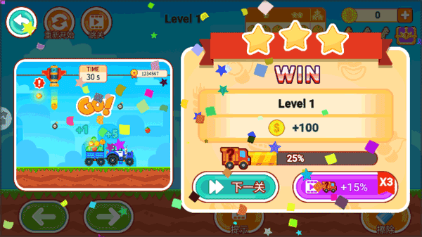 3、当所有水果都装载进货车后,便能顺利通过关卡,完成的质量越高,获得的星级也就越高。