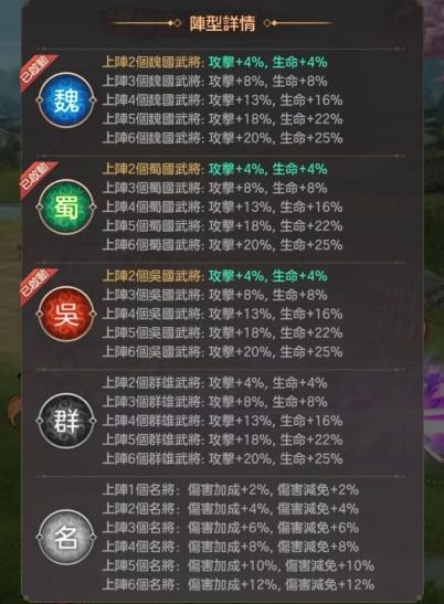 阵型会影响武将在实战中的属性。由于在这款游戏中,武将分属于魏,蜀,吴和群雄四个阵营,因此在搭配阵型时,不同的阵型会带来不同的属性加成。我们可以通过这种属性加成,来让武将打出更多的输出。