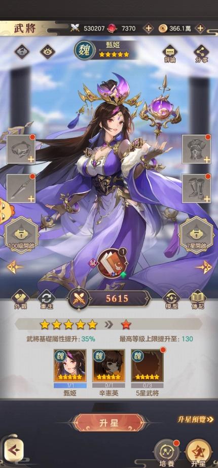 不过在培养武将方面跟其他同类型的游戏差不多,除了抽角色和收集材料帮武将升等突破后,就没什么好做了。不过因为开服时期官方送得蛮大方,玩家可以好快的就抽到5只5星角色,加上推关奖励送的好用奶妈「蔡文姬」就可以组成一队开荒队伍了,而且在刚开服官方送得一大堆资源,可以很快地把角色升到5﹑60等左右,就算是无氪玩家,也可以在前期轻松体验一番碾压敌人的爽快感。