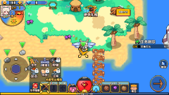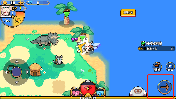 3、收集木头,走到椰子树旁边,点击右下角的箭头,就可以采集到木头和鲜甜的椰子。