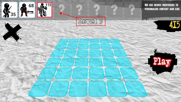 2、玩家选定上方要购买的火柴人之后,点击下方蓝色框框即可上阵火柴人,摆好阵型点击play即可开始游戏,如果觉得阵型不好,玩家可以点击左上角的X,重新摆阵,当然也是需要尽量把远程兵放到后排,并且用近战兵将他们包围起来,保护好主力输出。