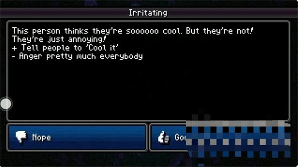 对别人说cool it,cool it对npc使用,前几次使用必定触发负面事件。当cool it闪光时使用必定触发积极事件。