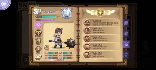 4.评价:拥有“上古之力”的暗属性蛮族狂战士是推图的好帮手,而其核心就是“上古之力”这个技能。狂战士要打出高额输出,则较为依赖狂暴之血的叠加。越快地叠满10层,则能更早地进行输出,以保证狂战的安全,否则还没输出就被敌方秒掉那就会非常尴尬。而希尔妲的好处就在于多出来的一层狂暴之血和歧立不倒的效果。狂暴之血的效果是,除了部分技能可直接提升外,主要还是通过击打敌人或者被敌人击打。多出来的一层狂暴之血则意味着希尔妲可以提前一个回合将狂暴之血叠满10层,并且就算叠满之后被怪打死了也会触发歧立不倒效果,可以让我们发动一次强力技能直接带走对方,因此希尔坦作为狂战士,属性和特性可以说都非常完美。