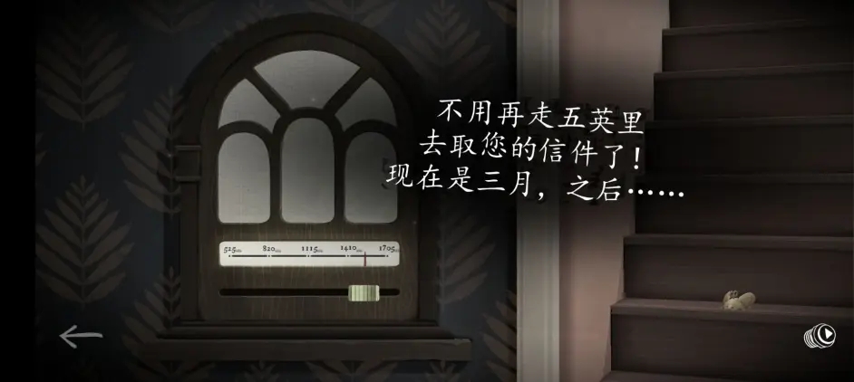 要素包含钟以及火车路线图。经观察可知,火车的相关机器缺失了一个“→”按钮,因此首先要寻找这个按钮。值得一提的是,该游戏的解谜顺序影响不大,所以我们按照场景从左至右逐个进行解谜。