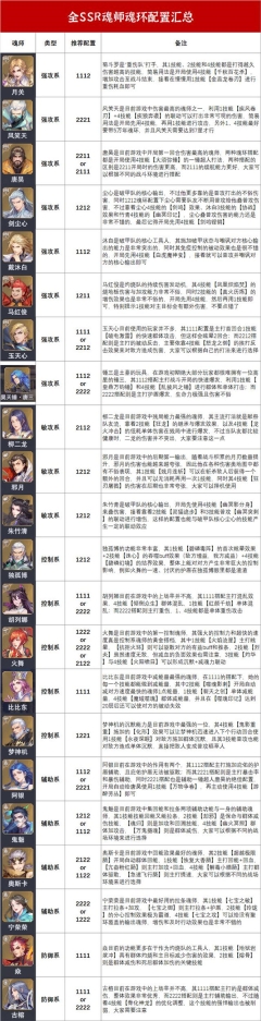 上图展示了目前游戏中总计22位SSR魂师的汇总情况。接下来,维一将逐一为大家分析每位魂师的推荐魂环搭配。此外,在文章末尾,维一还为大家制作了一张全SSR魂师的魂环推荐汇总图,有需要的朋友不妨收藏,以备不时之需,期望能对大家有所帮助。