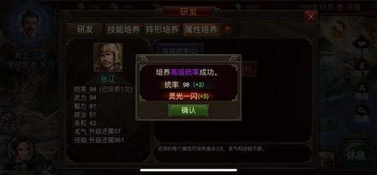 属性成长:在游戏中我们可以通过科技研究获得初级、中级、高级的属性卡。初级属性培养+7,中级+5,高级+3。且每一种属性最多进行3次属性培养,培养的时候有几率灵光一闪,灵光一闪的数值和初级,中级高级相匹配,即初级+7,中级+5,高级+3。