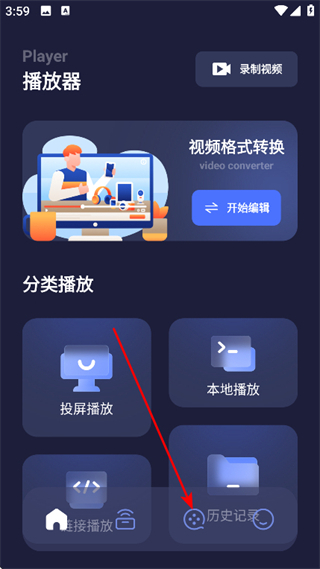 1、在播放器页面,点击历史记录,进入相关内容页面。