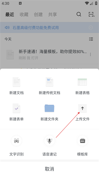 2、在功能菜单中点击【上传文件】,进入文件上传的选项界面。