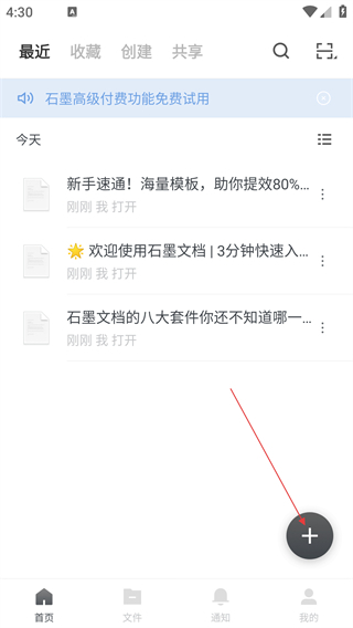 1、在首页点击右下角“+”按钮,展开功能选项菜单。