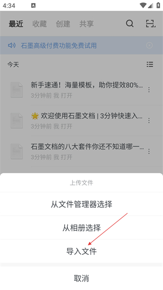 3、在上传文件界面,选择【导入文件】,进入文件选择页面。