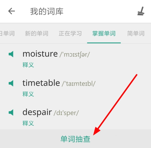 5、在我的词库页面中,点击掌握单词,向下滑动可以看到所有学过的单词,点击单词抽查可以检查自己还有哪些没有掌握。