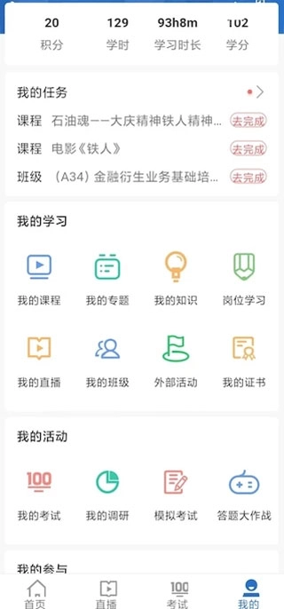 5、“我的”页面具备查询功能,可查看当前学习任务与进度,同时涵盖考试、我的班级、证书以及调研等内容。