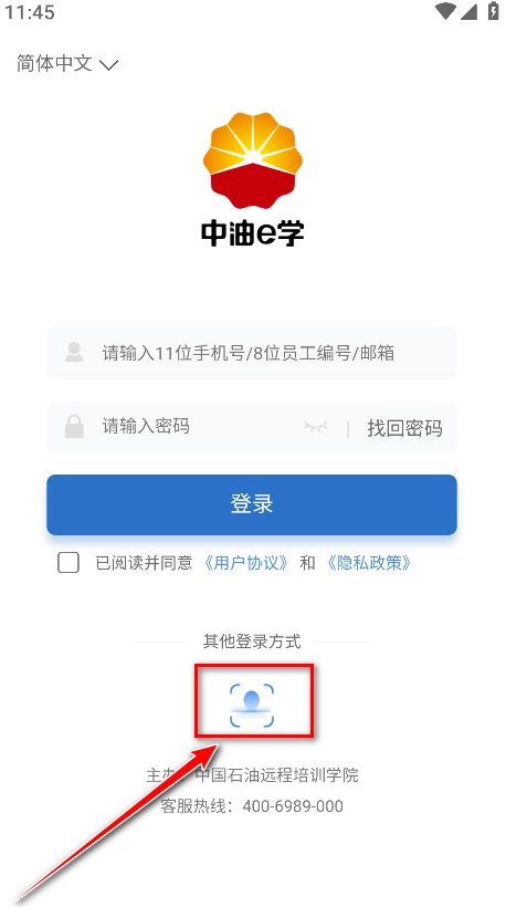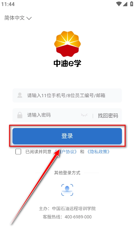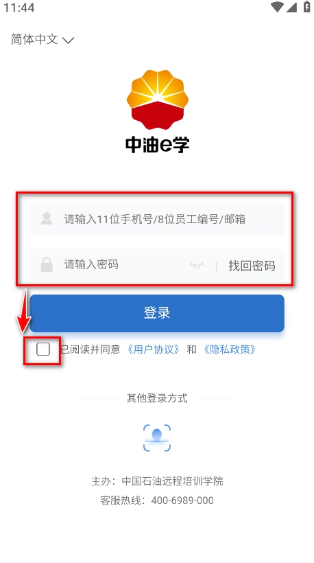 1.启动中油e学应用,依次输入11位手机号码、8位员工编号或邮箱地址及对应密码,随后勾选“已阅读并同意《用户协议》与《隐私政策》”选项。