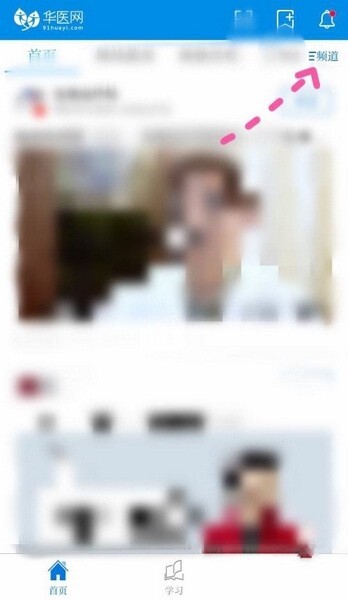 1、首先在掌上华医首页找到右上方频道点击进入。