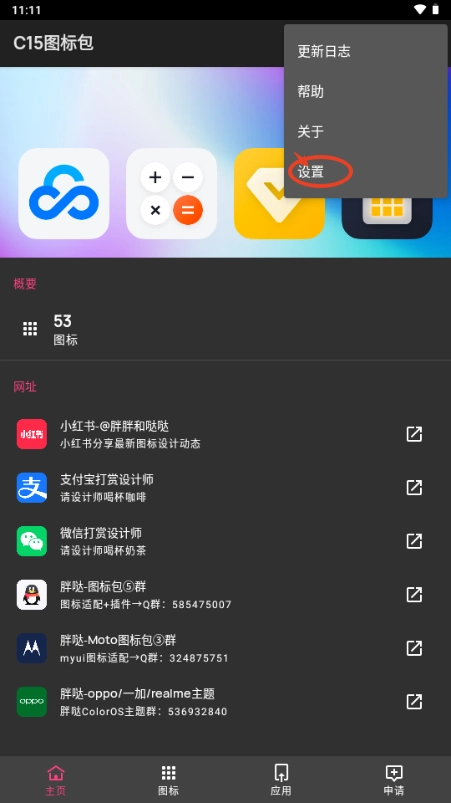 根据应用程序的导航方式类型,你需要从左侧滑调出导航抽屉,前往“申请图标适配”页面,或从底部导航栏前往。
