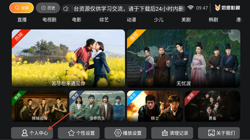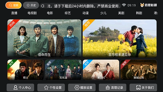2.进入主界面,有“直播”“电视剧”“电影”“综艺”“动漫”“少儿”“美剧”“韩剧”“热映”等分类,顶部有搜索栏和个人中心入口。