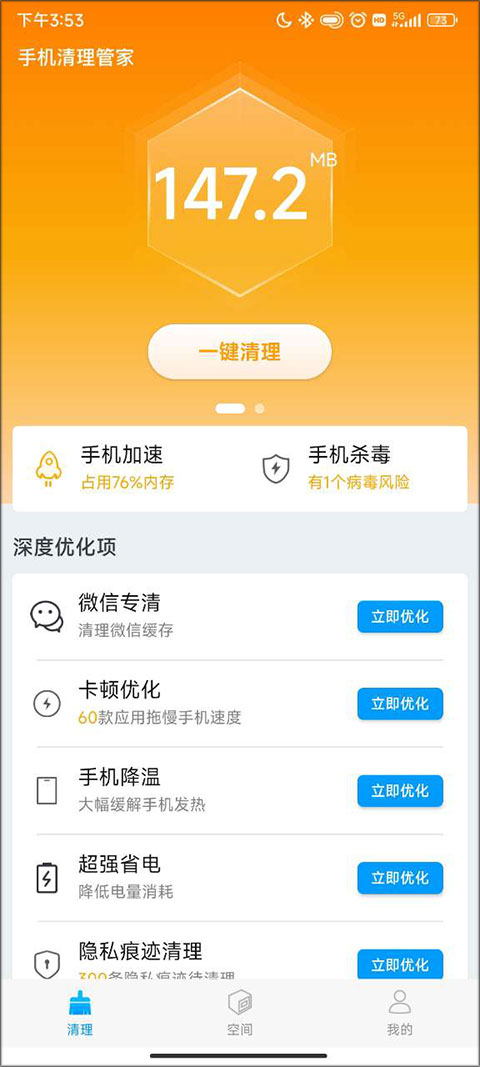 1、一键清理内存,提高手机运行速度,让手机拥有更多内存
