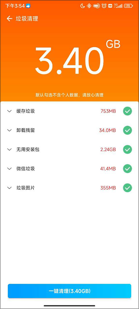 2、随后为你检测出手机内的垃圾文件,点击下方的一键清理。