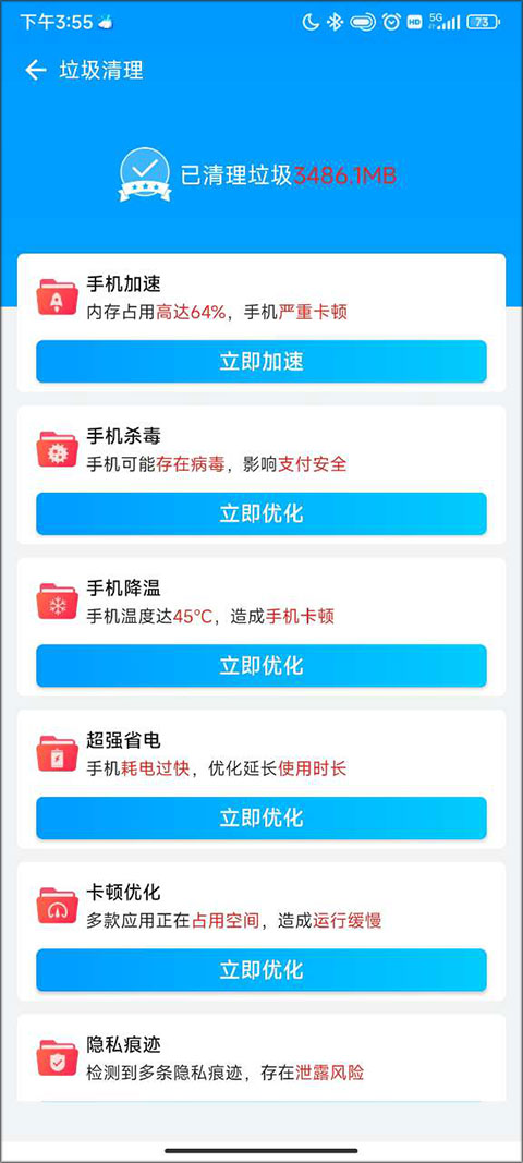 软件拥有着体积小、功能强、能快速、准确清理手机中的垃圾文件,同时操作使用起来也是比较方便的,一键进行加速清理内存,提升手机运行速度,有效地解决手机使用过程中卡顿、耗电、内存不足的问题。