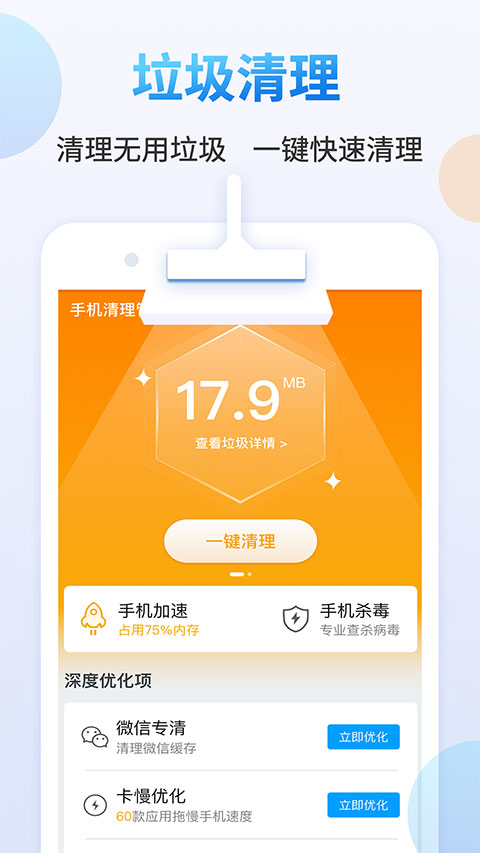 手机清理管家免费版,堪称一款极为实用的手机清理软件。它为用户精心打造了诸多实用功能,涵盖手机杀毒、CPU降温、电池省电、一键加速、垃圾清理,以及微信和QQ专项清理等。借助这些功能,能轻松助力用户解决手机卡顿、垃圾文件堆积等困扰。