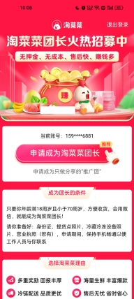 2、登录之后我们会来到软件页面,点击中间的申请成为淘菜菜团长;