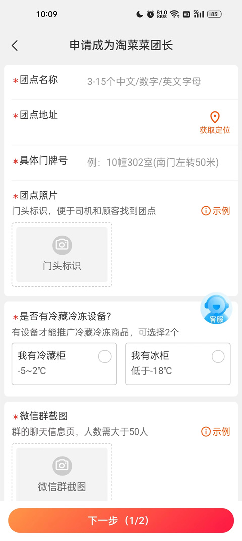 3、点击“申请”后,会进入申请页面。在此页面,需填写团点名称、团点地址、具体门牌号,并上传团点照片等信息。其中,上传营业执照尤为重要。完成上述操作后,点击“下一步”。