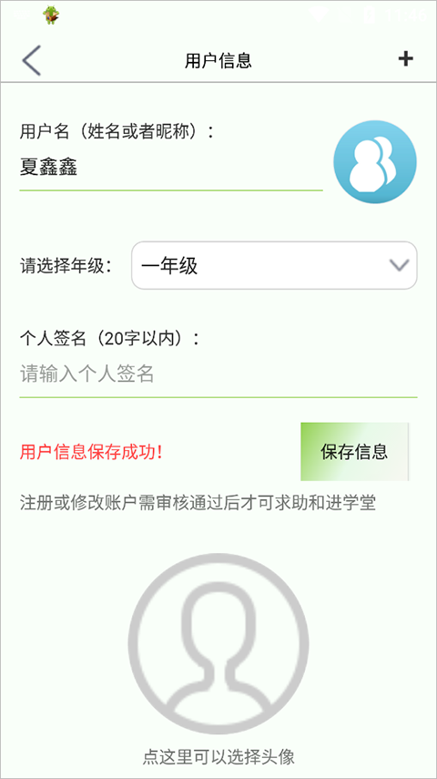 2、于“用户信息”板块,能够输入用户姓名、挑选年级并上传头像,完成后点击“保存信息”按钮。
