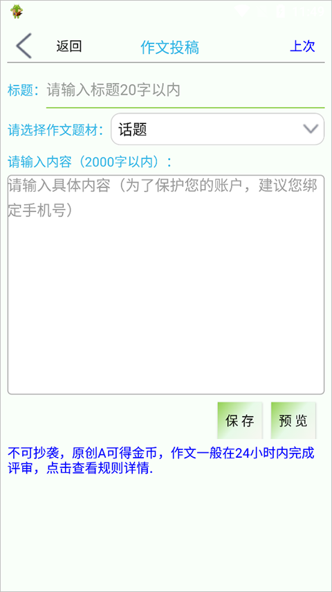 注意:只有原创A才有机会获得金币,作文通常会在24小时内完成评审工作。