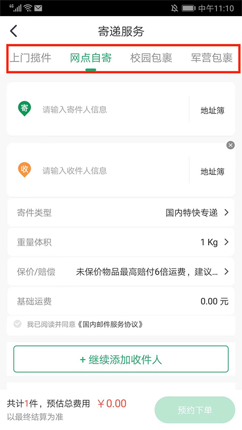 4、选择“网点自寄”,首先填写好“寄件人地址”和“收件人地址”,选择“寄件类型”、“重量体积”和“保价/赔偿”服务,勾选“阅读并同意”选项,最后选择“预约下单”选项,