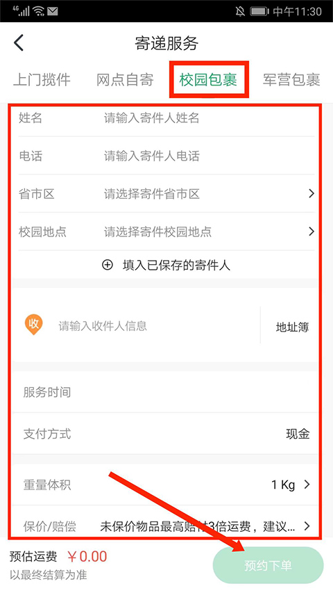 5、选择“校园包裹”,首先填写好寄件人“姓名”、“电话”、“省市区”、“校园地点”和“收件人信息”,然后填写重量体积”和“保价/赔偿”服务,最后选择“预约下单”选项,