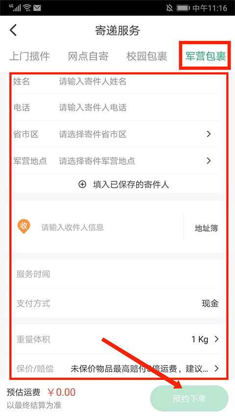 6、选择“军营包裹”,首先填写好寄件人“姓名”、“电话”、“省市区”、“军营地点”和“收件人信息”,然后填写重量体积”和“保价/赔偿”服务,最后选择“预约下单”选项,用户可根据自己的需求选择相应的寄件服务即可。