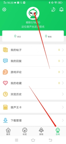 1、打开APP,第一步点击右下角的“空间”,接下来点击上方的“头像”。