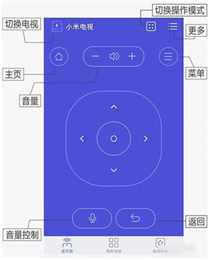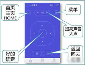 3、点击“小米电视(192.168.1.37)”,便能看到悟空遥控的主界面,其设计极为简洁。界面上有常见的选择键、确定键、菜单键、主页键、返回键以及音量键。下方设置了功能选择栏,而右上方则分别是切换手势遥控器按钮与更多设置按钮。
