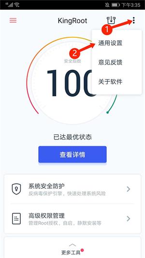 1、打开kingroot,选择右上角【三个点】,点击通用设置选项。