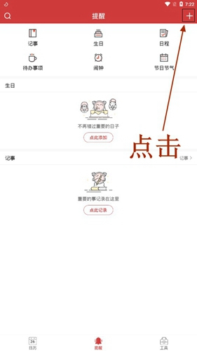2、来到提醒的功能分区以后,我们点击上方的【+】号来添加我们生日。