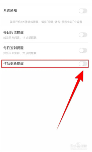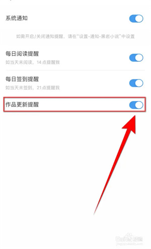【作品更新提醒】后面的圆点变为蓝色,即代表开启黑岩小说作品更新提醒成功。