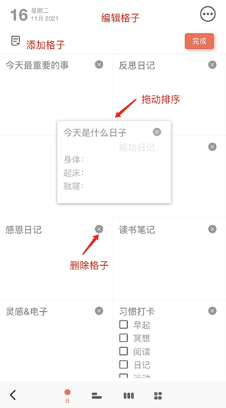 1. 借助九宫格样式的日记记录法,依据日记本所设的问题模板来规划每日记录方向,助力我们更有效地反思回顾当天情况,让养成记录日记的习惯变得更为轻松。