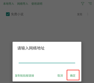 5、“网络导入”的操作极为简便,只需事先复制好你所找到的第三方书源网址,然后在输入框进行粘贴,最后点击“确定”即可。
