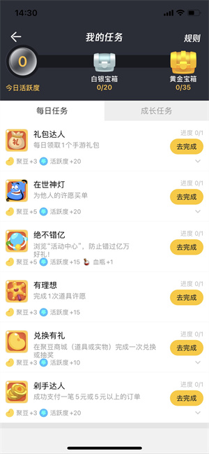 2、在APP完成每日任务/成长任务可获得聚豆,每日活跃度达到20和35,可开启白银宝箱和黄金宝箱,聚豆暴击!