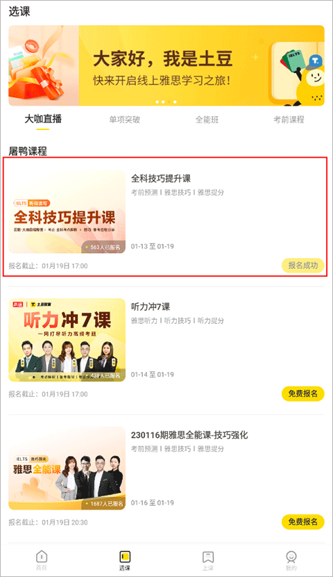 1、首先我们打开土豆雅思app官方版,在选课界面选择你已经报名的课程并点击。