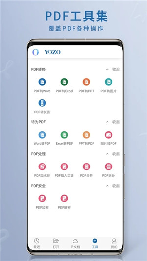 支持PDF文档打开阅读,支持文字处理和简报制作一键存储为PDF格式文档;支持PDF与其他常见文件类型的互相转换;支持PDF处理,包含PDF合并、拆分、加水印及页面插入。
