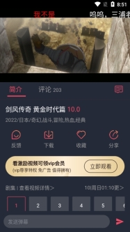 接下来,挑选一部自己钟爱的番剧,就像我选择了《剑风传奇》。点击进入《剑风传奇》的介绍页面,在这里能够知晓剧情概要、主要角色以及其他相关资讯。在页面的上方,能看到一个“点击领取VIP”的功能,用户通过领取VIP,可获得更多的观影权限以及特殊福利。