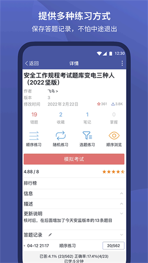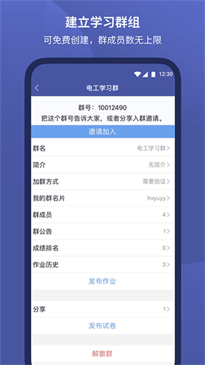 磨题帮软件还支持建立学习群组,且群组成员数量没有上限。用户可以在群组中发布最新的作业和分享学习心得,加快完成作业的进度。此外,该应用提供多种练习方式,并能保存答题记录,即使中途退出也不会丢失进度。