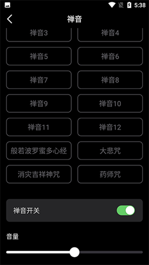 2、点击右上角音符图标,可以进行禅音的设定、禅音开关和调整音量。