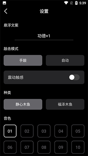 3、点击左上角设置,可以修改木鱼的悬浮文案、敲击模式手动还是自动、震动触感以及木鱼的种类。